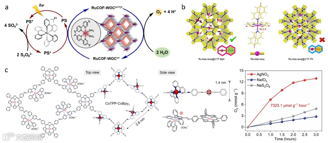 利用共价有机框架进行光催化分解水产氧半反应的报道远远少于产氢半反应的报道。产氧反应动力学过程复杂,且参与反应的空穴迁移率低,易发生复合。总结目前研究成果而言,三嗪基单元利于实现水氧化反应,联吡啶单元利于结合水氧化反应活性位点,π共轭及电子供体-电子受体结构利于电荷的分离及传输从而促进水氧化反应的进行。金属Ru、Co、Ni的氧化物及配合物分子可作为有效的水氧化活性位点(图5)。