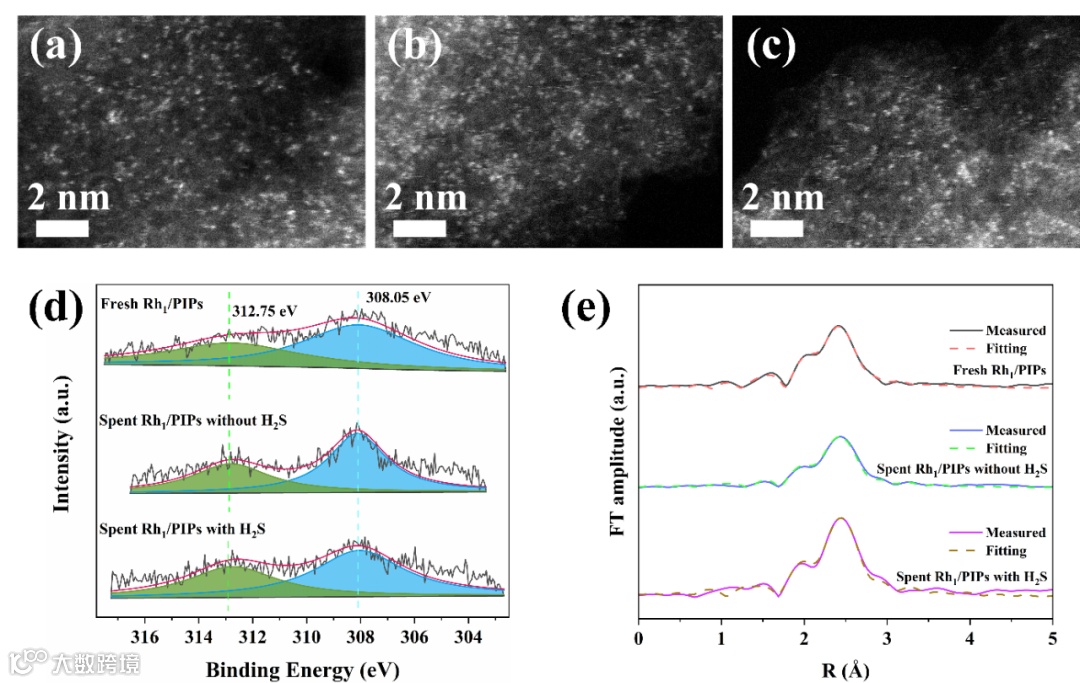 Figure 2. HAADF-STEM images of (a) fresh Rh1/PIPs, (b) spent Rh1/PIPs without H2S and (c) spent Rh1/PIPs with H2S.(d) Rh3d XPS spectra of fresh Rh1/PIPs, spent Rh1/PIPs without H2S and spent Rh1/PIPs with H2S. (e)EXAFS fitting of Rh k-edge in R space for fresh Rh1/PIPs, spent Rh1/PIPs without H2S and spent Rh1/PIPs with H2S.