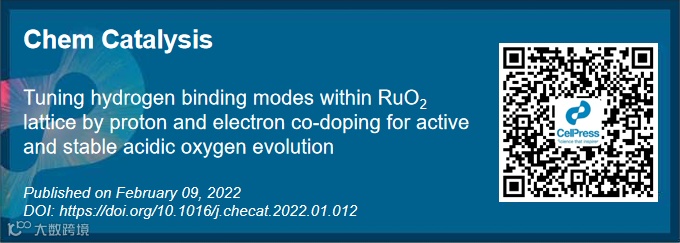 2022年2月9日,湖南大学王双印教授和中山大学卢侠教授合作,在Cell Press出版社期刊Chem Catalysis上发表题为“Tuning hydrogen binding modes within within RuO2 lattice by proton and electron co-doping for active and stable acidic oxygen evolution”的研究论文。该工作揭示了氢掺杂在调控氧化物电催化剂电子结构、稳定晶格氧和转变酸性OER催化路径中的重要作用。