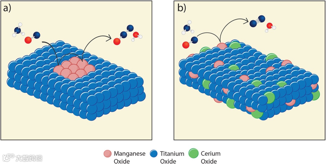 所有结果有力地证实了此合成路线使三元体系中所有金属原子分布均匀,并表明合成方法对于制备理想的完全混合三元金属氧化物是有效的。根据所进行的表征测量,在图3中说明了MnTi二元和MnCeTi三元催化剂的结构。