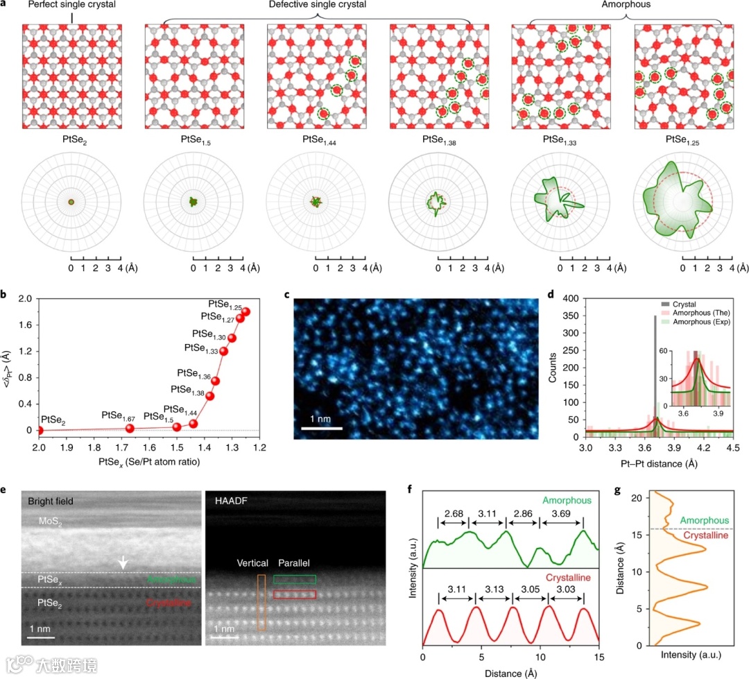 图2. 2D非晶态PtSex的形成机理:(a)PtSex随着x降低的结构演化AIMD模拟,其中红色为Pt原子,灰色为Se原子,并且在原子结构中欠配位的铂原子用绿色虚线圈标记;(b)2D PtSex中<δPt>与x函数关系的理论计算;(c)在伪彩色原子分辨率像差校正HAADF STEM中,对非晶态PtSex中Pt原子分布的实验研究;(d)来自实验(Exp)和理论(The)结果的非晶态PtSex和晶态PtSe2单层中两个相邻Pt–Pt原子之间距离的统计学分布;(e)非晶态PtSex层横截面结构的亮场和HAADF STEM图;(f)根据HAADF图中的绿色和红色矩形,得出非晶态PtSex层和晶态PtSe2层的平行强度分布;(g)根据HAADF图中的橙色矩形,得出穿过非晶态PtSex和晶态PtSe2层的垂直强度分布。
