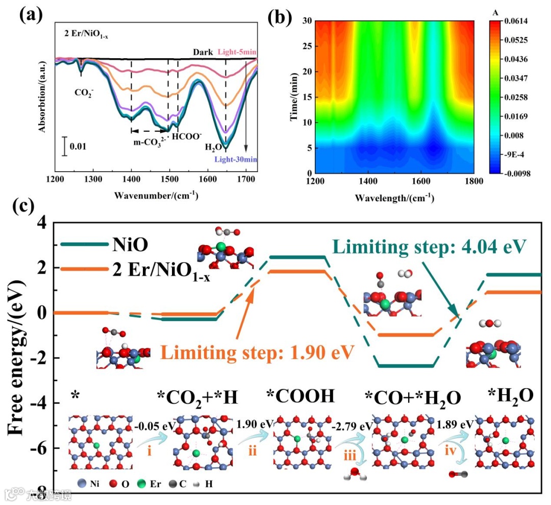 图6 (a) NiO和2Er/NiO1-x上的原位红外图谱和(b)对应的等高线图;(c) NiO和2Er/NiO1-x上DFT计算的自由能台阶图和对应的中间产物生成(“*”代表吸附态)