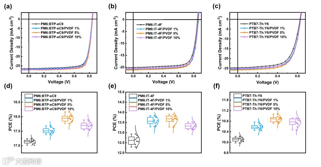 图7(a)基于PM6:BTP-eC9的有机太阳能电池极化后的J-V特性曲线和(d)平均PCE;(b)基于 PM6:IT-4的有机太阳能电池极化后的J-V特性和(e)平均PCE;(c)基于PTB7-Th:Y6的有机太阳能电池极化后的J-V特性曲线和(f)平均PCE。