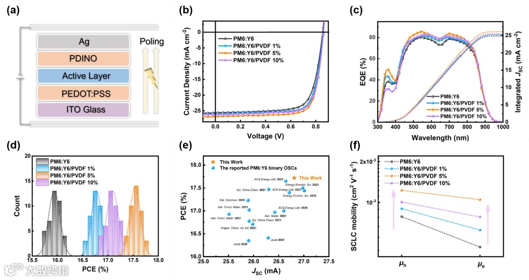 图2 (a)设备结构方案;PM6:Y6、PM6:Y6/PVDF1%、PM6:Y6/PVDF 5%和PM6:Y6/PVDF10%薄膜极化后的(b)J–V特性曲线和(c)EQE光谱图;(d)本研究中不同方案的有机太阳能电池的PCE值直方图;(e)总结了最近报道的基于PM6:Y6的二元有机太阳能电池的PCE; (f)用SCLC测量空穴和电子迁移率。