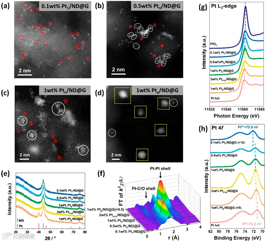 图1. Pt单原子、团簇、纳米颗粒催化剂的表征:(a)0.1 wt % Pt1/ND@G的HAADF-STEM图;(b)0.5 wt % Ptn/ND@G的HAADF-STEM图;(c)1 wt % Ptn/ND@G的HAADF-STEM图;(d)1 wt % Ptp/ND@G的HAADF-STEM图;(e)催化剂的XRD表征;(f)催化剂的傅里叶变换k3-加权Pt L3-edge EXAFS光谱;(g)催化剂的Pt L3-edge XANES光谱;(h)催化剂的Pt 4f XPS光谱。