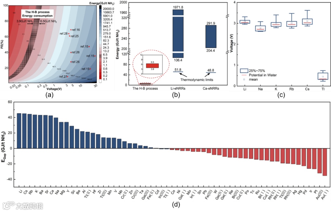 图2. (a) 法拉第效率和电池电压对能耗的影响。(b) H-B工艺、Li-eNRRs 和 Ca-eNRRs能耗范围。(c) 水和有机溶剂中电池电压的差异。(d) M-eNRRs工艺与 H-B 工艺之间的能耗差。
