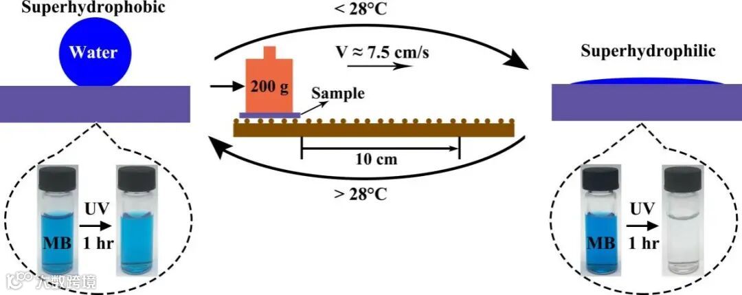 图1. 温控超润湿涂层的光催化性能调控:即使进行机械破坏,该涂层依然保持着稳定且可逆的超润湿转变,进而调控光催化性能。