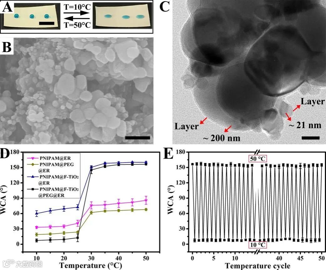 图2. 超润湿响应性涂料的表征:在涂层制备中,只有当环氧树脂(ER)、聚乙二醇(PEG)、氟硅烷(PFOS)、双尺寸二氧化钛纳米颗粒(TiO2,~200 nm和~21 nm)、聚异丙基丙烯酰胺(PNIAPM)全部定量化配比时,表面的温度响应型的超润湿性可以自由切换。并且,即使进行50次的温度变化,表面的超疏水性和超亲水性依然可以实现可逆转变。