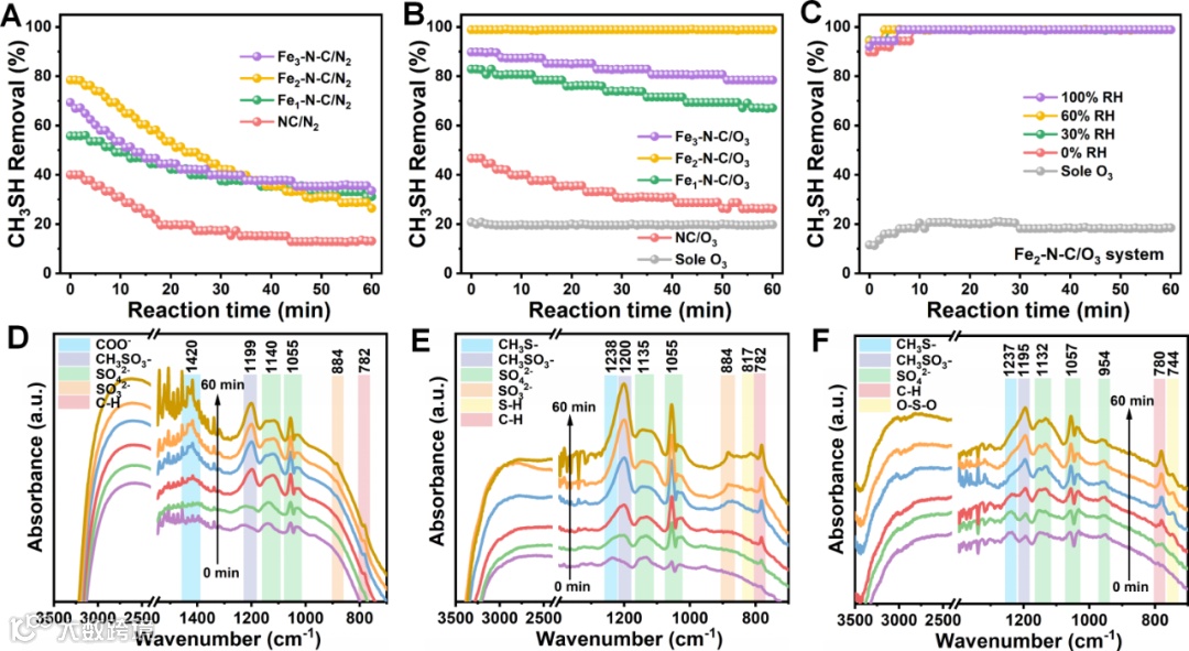 通过原位漫反射红外傅立叶变换光谱研究了多核催化剂对CH3SH的氧化行为。不同巯基分子(如CH3SH、CH3SSCH3和CH3SCH3)的氧化特性呈现显著差异。在Fe2-N-C/O3体系中,60分钟后CO2的转化效率达到了95.52%,而在Fe2-N-C/N2体系中,60分钟后CO2的转化效率仅为4.61%。相较于其他两种催化剂,Fe2-N-C更倾向于生成硫酸盐和乙酸盐物种,并在形成初始的甲烷磺酸物种和CH3S−中间体方面有较小的倾向。因此,CH3SH分子的消除路径包括S-H键的解离,随后部分氧化导致CH3SSCH3的形成,再生成有机硫酸盐和磺酸盐物种,最终通过C-S键的断裂氧化为SO42−和CO2。