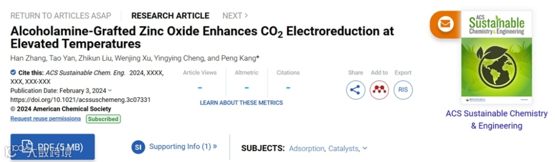 Han Zhang, Tao Yan, Zhikun Liu, Wenjing Xu, Yingying Cheng, Peng Kang*. Alcoholamine-Grafted Zinc Oxide Enhances CO2 Electroreduction at Elevated Temperatures, ACS Sustainable Chem. Eng. 2024, DOI: 10.1021/acssuschemeng.3c07331