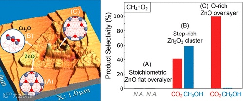 图2.(顶部)ZnO/Cu2O/Cu(111)表面活性的变化与ZnO覆盖率的函数关系。(底部)比较ZnO/CuOx/Cu(111)、CeO2/CuOx/Cu(111)、Ni/CeO2(111)的甲醇形成选择性。所有实验均在450 K、1 Torr CH4和0.5 Torr O2压力的间歇式反应器中进行。。