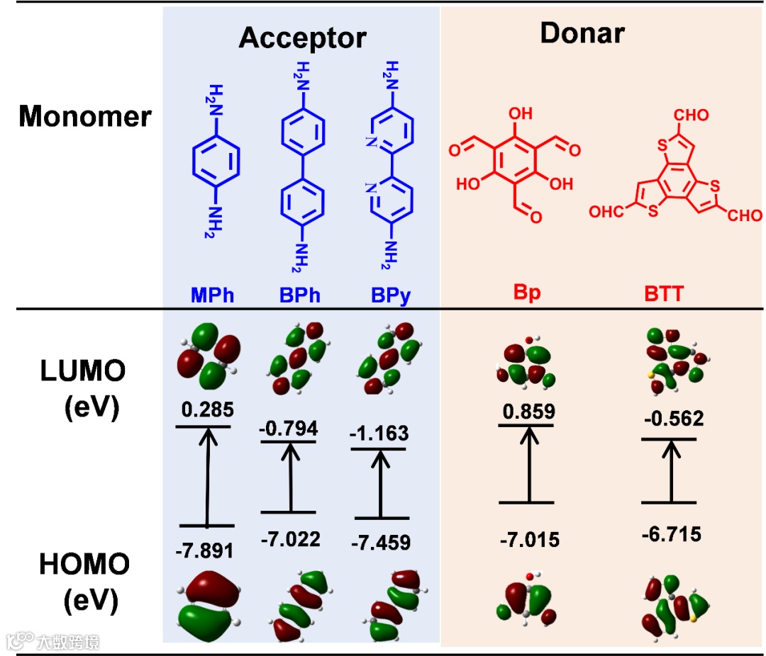 图1: 构建D-A对的两类构件的HOMO和LUMO能级图。