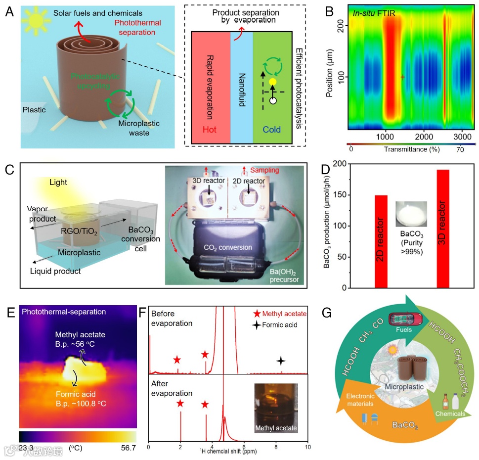 这项工作针对光热/光催化耦合体系中因光热热量耗散与不可控分布进而导致集成效率低的问题,提供了利用纳米纤维实现有效热管理的新策略。作者在1D纳米纤维中有序排列光热与光催化组分,实现对光热热量限域、通过流体进行过热冷却,形成流体热交换阵列。进一步克服纤维脆性问题,实现纤维宏观化与3D纤维反应器组装。所获新型反应器可以高效捕捉水中微塑料污染物,并将微塑料高效转化升级成为重要化学品中间体乙酸甲酯与甲酸等。利用光热蒸发,可100%原位分离出目标产物乙酸甲酯。提供了光驱动升级转化微塑料污染物的新方法,为解决全球塑料污染问题与塑料循环经济发展提供了新策略。