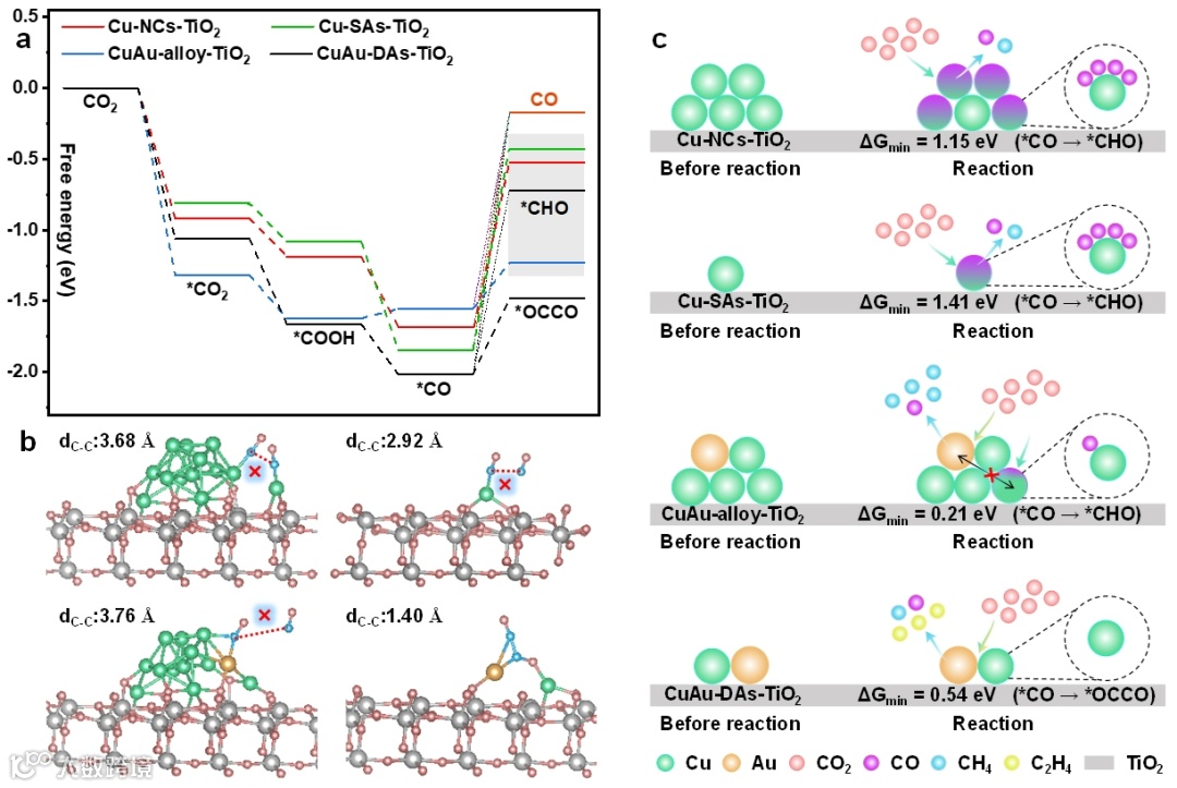 图4.(a,b)E7-Cu5Au1-TiO2上光催化CO2转化原位红外光谱图分析;(c)CO2转化为C2H4的吉布斯自由能分析。