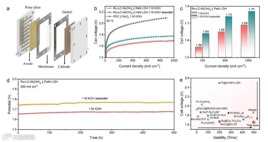 4. 精心设计的Ru-LC-Ni(OH)2催化剂表现出显著的催化活性,在10和1000 mA cm-2 的电流密度下过电势分别为9和136 mV。即使在碱性海水的阴离子交换膜电解槽中,基于Ru-LC-Ni(OH)2催化剂的阴极也能在500 mA cm-2的工业级电流密度下保持500 h的优异稳定性。