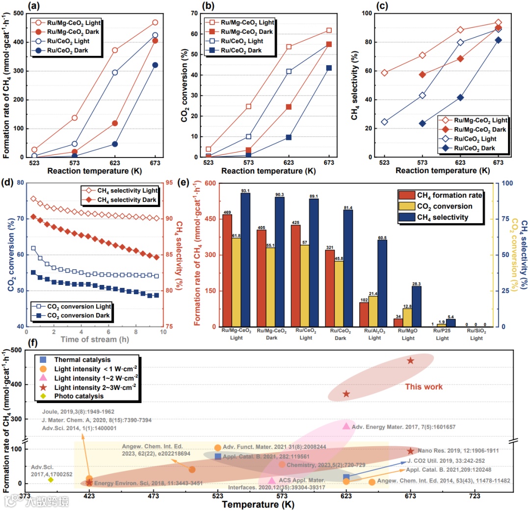 在光热催化反应中,Ru/Mg-CeO2催化剂在400 oC,2.9 W/cm2光强,高气速下(GHSV: 200000 mL·gcat-1·h-1),CH4生成速率为469 mmol·gcat-1·h-1,单位质量Ru的产率为93.8 mol·gRu-1·h-1,高于大多数现有研究报道结果。