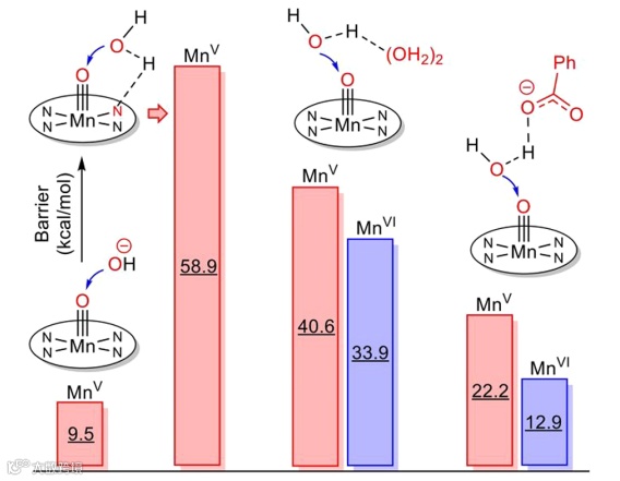 对被1e 氧化的 MnV(O)的水亲核攻击可能参与催化循环,但直接对 MnV(O) 的水亲核攻击不太可能是O-O键形成的主要途径。
