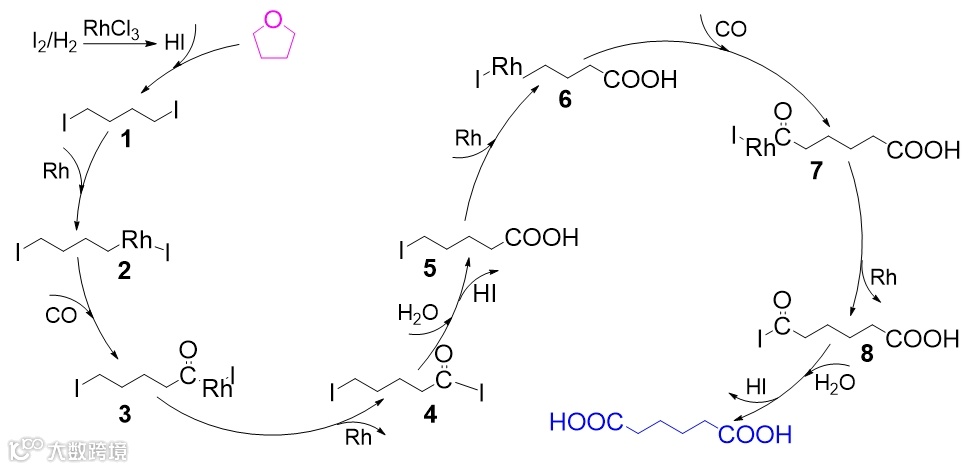 图4 提出的THF合成己二酸的二羰基化机理(注:Rh代表铑活性中心)