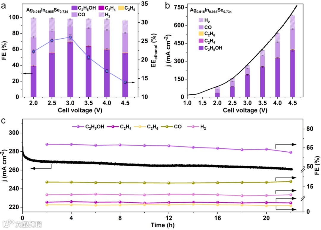 图5:Ag0.015In0.985Se0.734在MEA电解槽中的电催化性能。a) 不同电压下Ag0.015In0.985Se0.734上CO2ER产物的法拉第效率和乙醇的能量效率。b) 不同电压下Ag0.015In0.985Se0.734的LSV曲线及CO2ER产物的偏电流密度。c) Ag0.015In0.985Se0.734在3.0 V电压下进行22 h的计时电位测试结果。