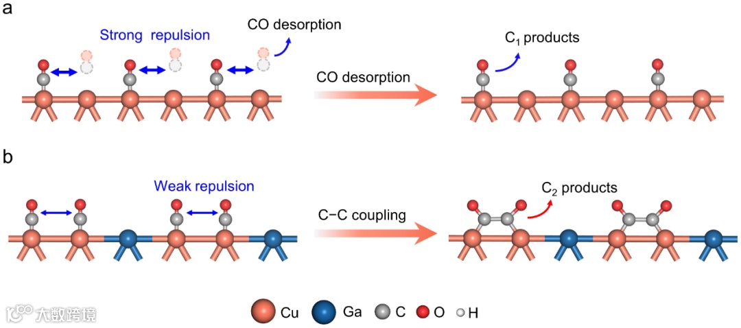 图1 a) Cu和b) Cu9Ga4表面*CO之间的排斥作用。