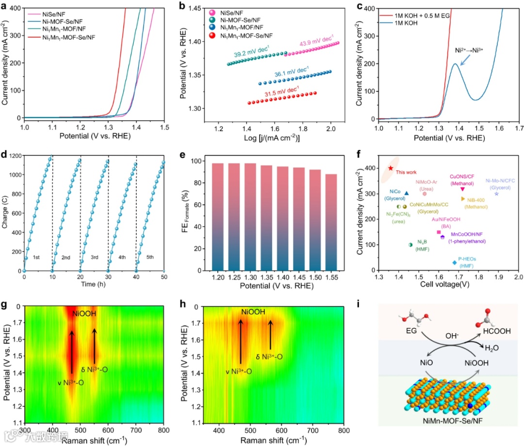 总的来说,本文首次开发出一种耦合阴极ORR至H2O2转化和阳极废弃PET高值化反应过程的电化学合成系统。通过引入高价态金属Mn和杂原子Se,所构筑出的Ni1Mn1-MOF-Se/NF催化剂在EG氧化反应过程中表现出优异的催化性能,仅需1.327和1.362 V的低电压即可分别实现100和400 mA cm−2的电流密度。利用XAS和原位Raman光谱分析,揭示出NiOOH作为活性组分的催化机理以及Mn和Se的协同作用。对于阴极反应而言,所设计出的B/N-洋葱碳催化剂在ORR至H2O2转化过程中具有高达97.5%的法拉第效率,分别仅需0.66和0.60 V的低电压即可驱动200和400 mA cm−2的电流密度。此外,ORR||PET转化电合成系统分别仅需0.712, 0.794和0.927 V的超低电压,即可获得100, 200和400 mA cm−2的工业级电流密度,性能优于此前报道的H2O2电合成体系。通过开发两条将H2O2转化为BPO和SPB的下游路径,可成功以低能耗且低成本的方式分离电解液中热力学不稳定的H2O2产物。技术经济性评估凸显出ORR||PET转化系统比HER||PET转化和ORR||OER系统更加卓越的节能与成本优势。该研究为促进H2O2电合成的工业应用提供了一种电化学配对和产物转化的节能途径。