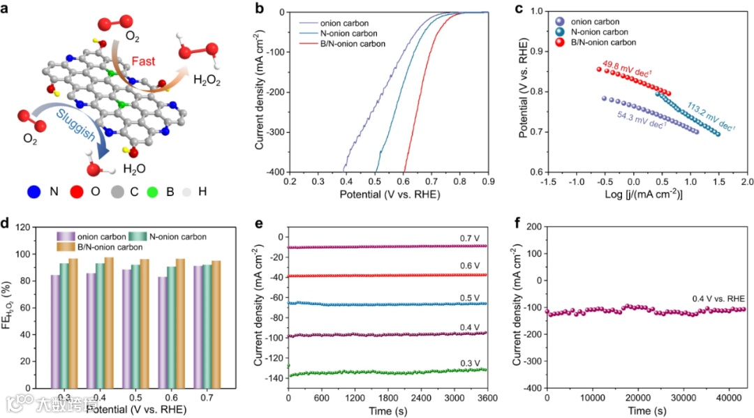 过氧化氢(H2O2)作为一种性能优异的氧化剂,被广泛应用于造纸、废水处理、医药、纺织等领域。目前,工业上用于合成H2O2的传统蒽醌方法面临着工艺流程复杂、污染严重以及高能耗等问题。得益于温和的运行条件、由可再生能源直接提供的低电压、丰富的氧气原料、高产物选择性和高产率等优势,基于2e-传输路径的电驱动氧还原反应(ORR)生成H2O2 (ORR至H2O2转化)被广泛认为是一种极具前景的途径。随着催化剂材料的创新设计与不断深入的机制研究,该领域已得到快速发展。例如,无金属碳材料(硼掺杂炭黑, 碳纳米管)、金属单原子催化剂(Co–N–C, Pd–N–C基体复合材料)、过渡金属杂化材料(NiBx, CoSe)等被开发作为催化剂,以实现ORR至H2O2转化过程的高选择性和高产率。尽管如此,设计具有低成本、均匀负载以及长期稳定性的催化剂仍然值得进一步关注。