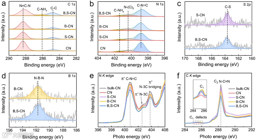 XPS和XANES光谱结果表明在g-C3N4的结构中,掺杂的S原子取代C-N=C中的N原子,掺杂的B原子取代C原子。