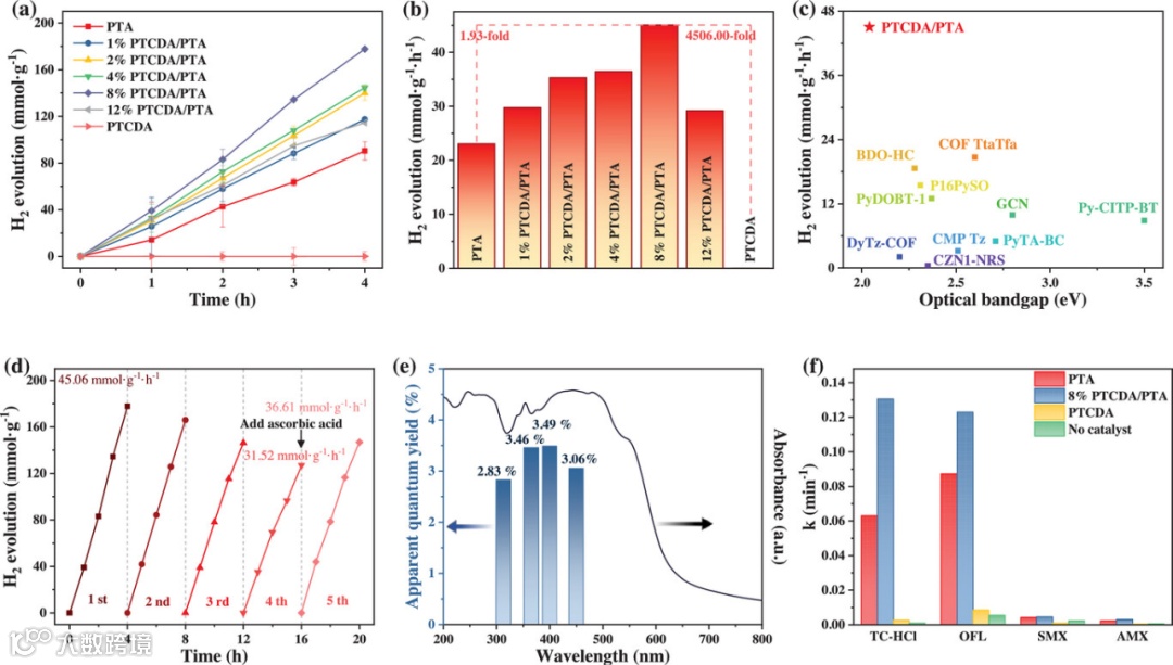 图2(a)光催化产氢性能和(b)光催化产氢速率;(c)部分其他已报道的有机催化剂;(d)循环光催化产氢测试;(e)8%PTCDA/PTA的产氢表观量子效率;(f)8%PTCDA/PTA对不同抗生素的降解速率。