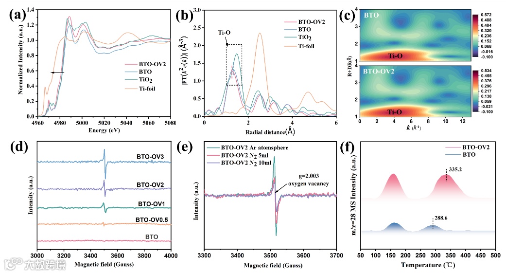 图2. a-c) BTO和BTO-OV2的Ti k边XANES谱,傅里叶变换k边EXAFS谱和WT-EXAFS谱。d) BTO-OVX的EPR信号。e) Ar和N2气氛下BTO-OV2的准原位EPR。f) BTO和BTO-OV2的N2-TPD。