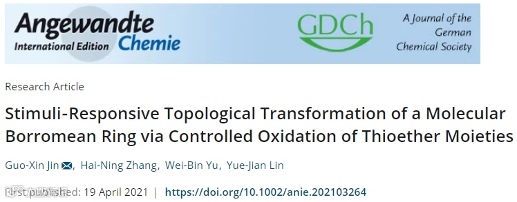 对于具有复杂拓扑结构的有机金属超分子化合物来讲,其自身较好的稳定性很大程度上限制了其在温和条件下发生拓扑性结构转变的可能性,而如何利用化学手段来实现上述过程则逐渐成为超分子化学领域里一个具有挑战性的课题。近日,复旦大学化学系金国新教授课题组将硫醚化合物的可控氧化发展成为一种结构后修饰的方法,即利用含有硫醚单元的双吡啶配体与多齿配体在金属角的作用下构筑成一系列有机金属超分子化合物,之后通过精确控制氧化剂的加入量来实现超分子结构中硫醚配体的可控氧化,不但实现了由双核有机金属大环到四核有机金属大环化合物的刺激响应性超分子结构的转化,而且也实现了由分子Borromean环到四核有机金属大环化合物的刺激响应性拓扑的转化,该过程不仅可以通过利用液体核磁表征实现全程监控,同时还通过培养对应化合物的单晶后利用X-射线单晶衍射分析的手段得到上述化合物的单晶结构来证明该过程的实现。