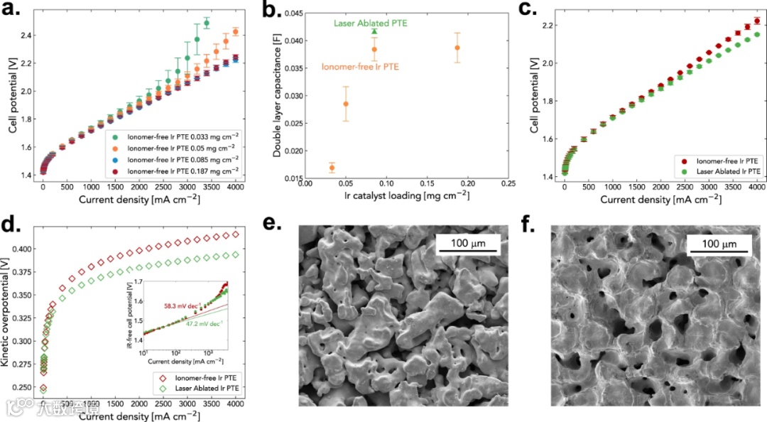 制取清洁氢气需要大规模部署电解水技术,特别是质子交换膜水电解槽(PEMWEs)。然而,铱基电催化剂仍然是PEMWEs应用的唯一实用选择,其低丰度成为可持续性氢经济发展的瓶颈。在本文中,作者设计出一种具有高性能和耐久性的无离聚物多孔传输电极(PTEs),其表现出可回收特性以节约和回收Ir组分。研究发现,该无离聚物多孔传输电极为深入分析离聚物在催化剂层中的作用提供了一条实用性途径,并通过微电极测试指出离聚物对析氧反应的毒化效应。测试表明,与传统离聚物涂覆多孔传输电极相比,该无离聚物多孔传输电极在1.8 A cm−2和<0.1 mgIrcm−2条件下的电压降低了> 600 mV,且在4 A cm−2电流密度下的50000次循环加速应力测试后,电压衰减仅为29 mV,平均衰减速率为0.58 mV/1000次循环。此外,无离聚物特性可以使PEMWEs中的多种组分实现高效回收,这对于循环清洁氢经济至关重要。