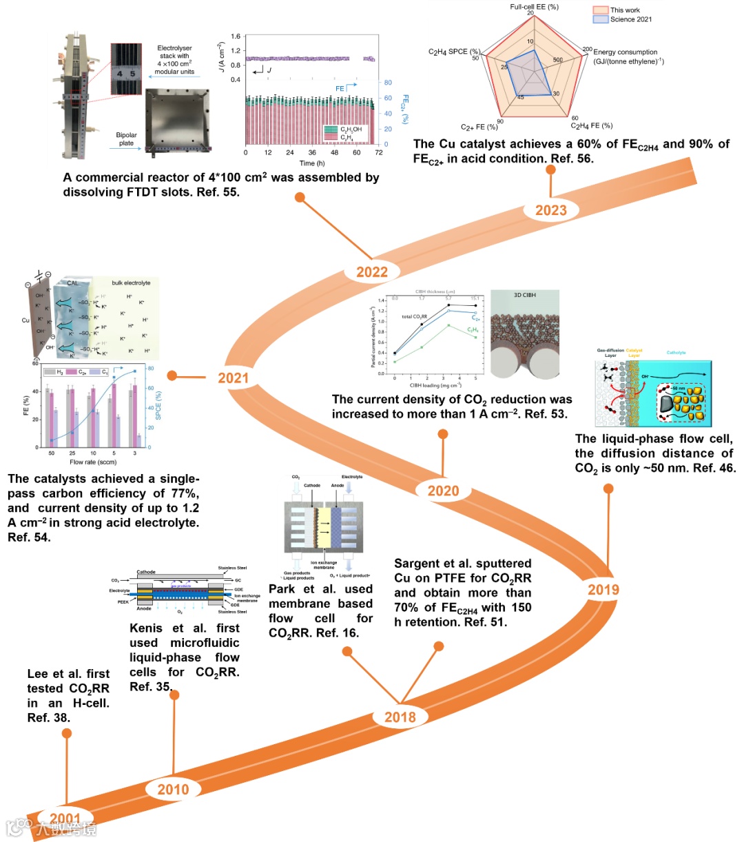 综上所述,通过研究CO2还原流动型电解池的组成结构以及优化策略是未来进一步推动CO2还原实现工业化应用的关键因素。然而,低成本、高效率的流动池中CO2还原为高附加值产品仍然是一个巨大的挑战,未来仍有许多方向值得进一步被研究。
