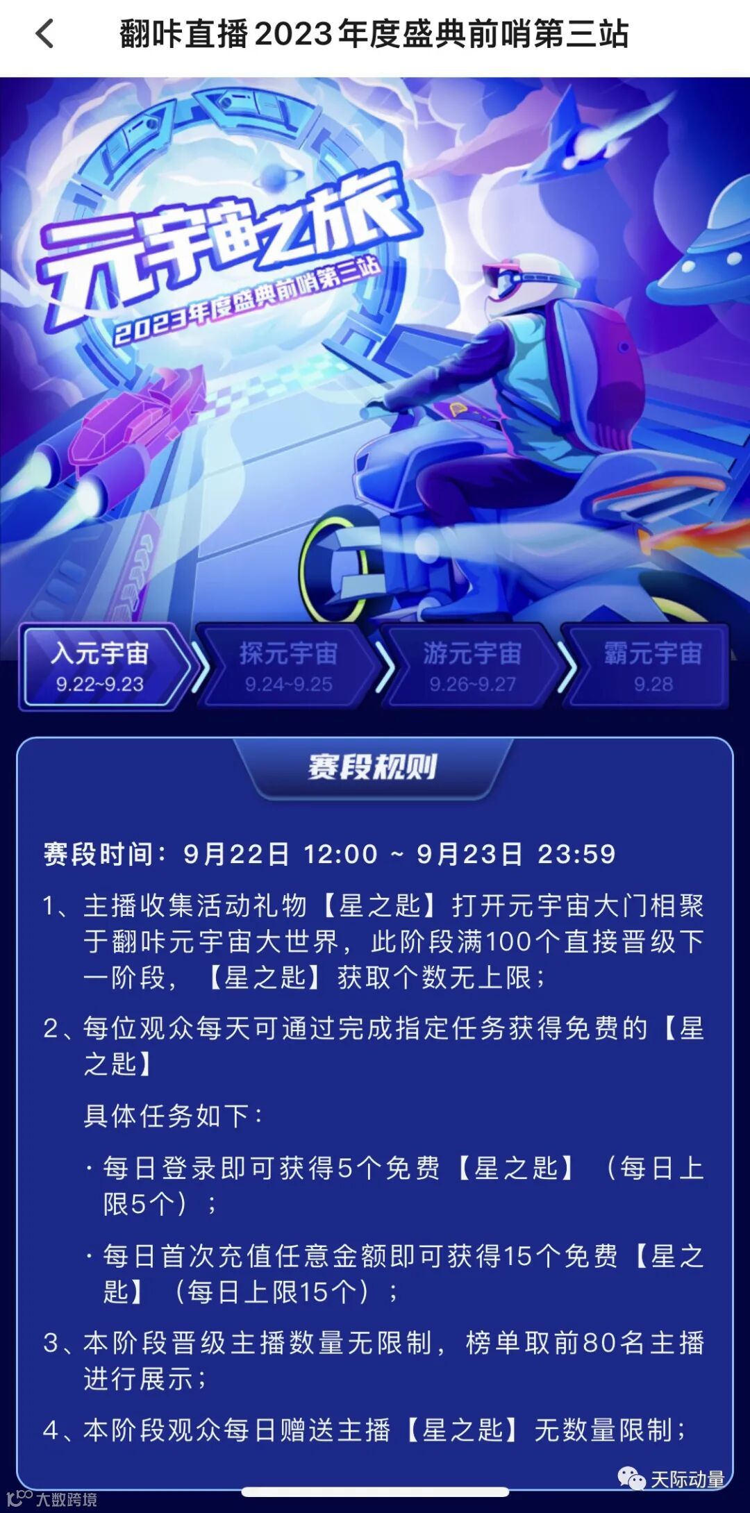 翻咔直播 2023 年度盛典 前哨 第三站 开始啦。主播们可以在翻咔直播首页Banner处了解比赛具体规则。第一轮晋级后,天际动量@UniquX Live将会公布公会主播第二轮晋级后的直播礼物奖励规则。请主播踊跃参与!