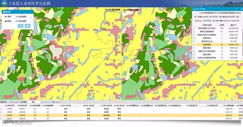 平台提供对比分析服务,支撑土地利用变化监测、规划差异性分析、业务审批数据差异分析等应用需求,支持空间图形和属性信息的差异对比,支持差异分析结果的分类统计。