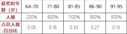 因此,获得者获奖时年龄普遍偏高,平均年龄为83岁。获奖时86岁以上者有14位。(见表2)
