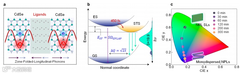 图4 纵声学声子折叠模式驱动的自陷态发射机制解析。(a)超晶格中的声学纵声子折叠模式引发晶格畸变;激子被局域化形成自陷态;自陷态局域线宽同晶胞长度相仿。(b)简正坐标下的自陷态能级图。(c)控制超晶格堆叠使自陷态发射光谱在色坐标上移动。