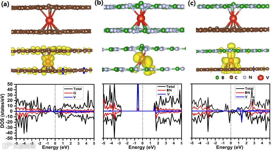我们还比较了单独的BN,单独的石墨烯和这两者组合作为V原子覆盖物的三明治结构的NRR反应活性(图4)。结果发现,与G/V/G和BN/V/BN相比,BN/V/G结构的NRR催化过程需要克服的自由能垒最低,说明BN片和石墨烯包夹的TM原子产生的优化极化场极大的提高了NRR活性。我们还计算了H在B位点上的吸附能来考察竞争反应HER的性能,结果发现,H会强烈地吸附在B位点上难以脱附,从而有效抑制HER的发生。
