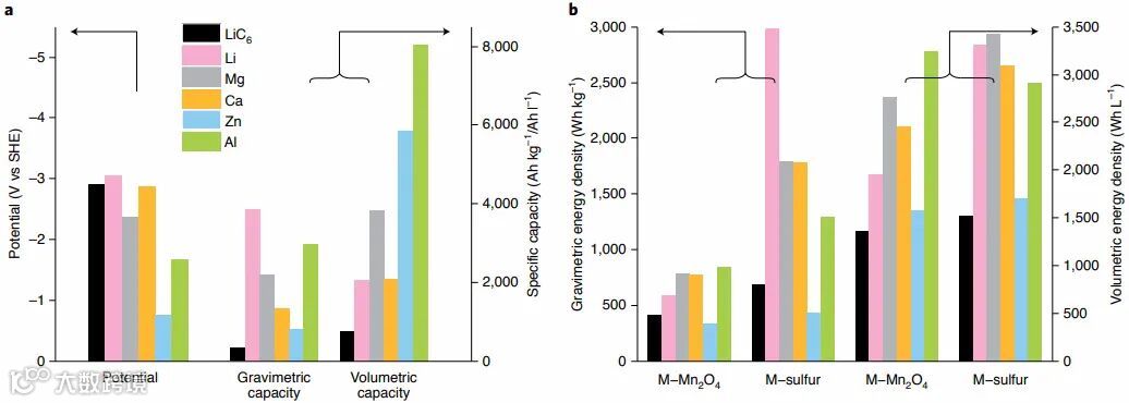 多价金属离子电池的预期能量密度存在争议,需要进一步澄清。一项通用的评估只着眼于负极,特别是使用纯金属负极。纯金属负极具有高比容量、相对较高的密度和高能量密度。这一评估不与锂基负极相比。多价金属的氧化还原电位通常较低,这可能导致多价金属离子电池的体积能量密度高于锂基电池的体积能量密度。由于多价金属的原子重量较高,其重量能量密度略低(图1a)。事实上,电池的能量密度由正负极决定。在这里,作者考虑了两种正极材料。一种是高电压、中等容量的Mn2O4尖晶石,另一种是低电压、超高容量的硫(图2b)。Mn2O4很好地代表了许多AO2氧化物(A是一种过渡金属)。在高工作电压下,Mg和Ca电池的电解液能与负极稳定相容。这种正极材料已经在理论上进行了详细的研究,尽管所有多价金属离子的可逆插层还没有被实验证明。硫与几种多价金属配对时表现出令人鼓舞的性能。石墨是锂离子电池的标准负极材料,也与之进行比较。上述分析表明,多价金属离子电池的任何能量密度优势都是在一定条件下才能实现的,与金属负极的性能参数有很大的不同。多价金属离子电池被视为大规模储能的替代方案。