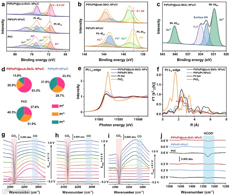总的来说,本文报道了一种新型 PtPb/Pt@sub-SbOx 纳米颗粒,其表现出较高的FAOR催化活性。表面嵌入的亚单层SbOx与金属间化合物结构相结合,使其表现出近乎最佳的FAOR性能。并且,PtPb/Pt@sub-SbOx NP 的FAOR 比活性和质量活性高达28.7 mA cm–2和 7.2 A mgPt–1,分别是商业 Pt/C 性能的 151 和 60 倍。相应的XPS和XAS研究结果表明,亚单层SbOx可以有效地影响Pt的局域配位环境。电子从 Pb 和Sb 到 Pt 的转移以及连续 Pt 位点的减少,促进了 HCOOH 的直接脱氢。同时,更活泼的 Pt 位点的产生极大地提高了FAOR性能。原位 FT-IR 光谱进一步证实亚单层 SbOx 会抑制 CO 的生成,并促进脱氢途径进行。该工作通过在金属间化合物表面构建亚单层结构,成功开发出一类新型高性能FAOR催化剂,这为开发先进的FAOR铂基催化剂提供了重要启发。