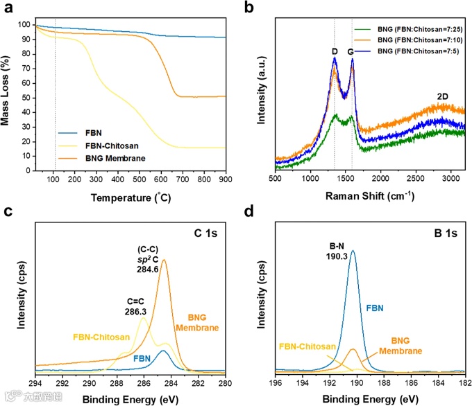 图 2. FBN 和壳聚糖膜、FBN-壳聚糖前体和制备的 BNG 异质结构膜的化学结构。 a FBN 薄膜、FBN-壳聚糖前体和 BNG 膜的热重分析 (TGA)(FBN:壳聚糖 = 7:10)。 b 不同比例(FBN:壳聚糖=7:25、7:10 和 7:5)的 BNG 膜的拉曼光谱图。 c, d BNG膜表面元素(C 1 s和B 1 s)化学态的XPS光谱(FBN:壳聚糖 = 7:10)。