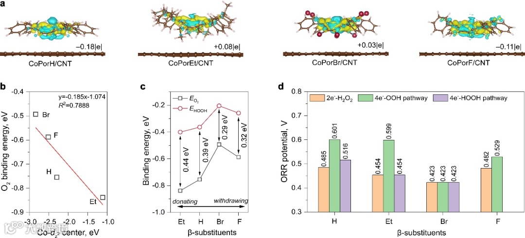 图2:HMC模型的理论预测。(a)通过向石墨烯表面添加卟啉分子引起的各种HMC模型的差分电荷密度(黄色和青色等值表面分别表示电荷积累和消耗,等值面值为0.002 Å−3).(b)计算出的Co-dz2之间的关系轨道中心和*O2结合能(EO2)在不同的HMC型号上。(c)β取代基与中间体*O2和*HOOH(EHOOH)的计算结合能之间的关系。(d)沿不同反应途径的理论ORR电位。