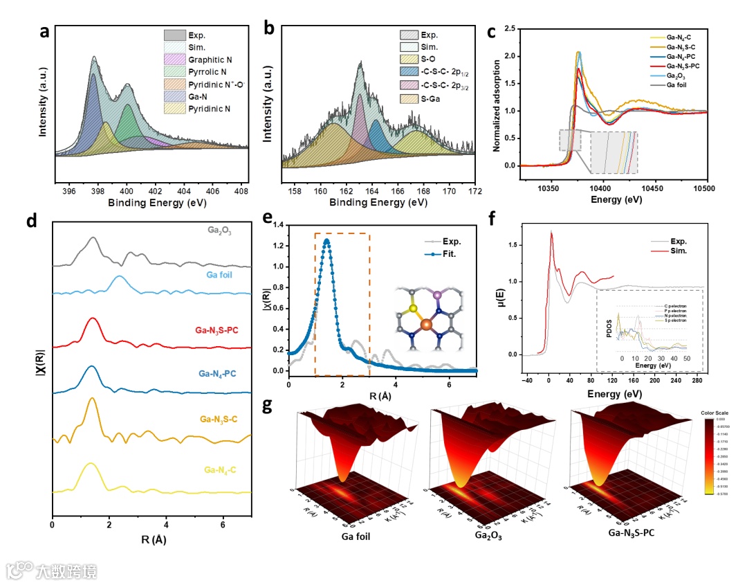 Figure 2. a-b, XPS spectra of Ga-N3S-PC catalyst: a, N 2p spectral region, and b, S 2p spectral region. c, the normalized near-edge absorption spectra of Ga K-edge. Inset is the absorption edges for Ga species. d, R-space spectra for different Ga SACs. e, Fitting result of the Ga-N3S-PC catalyst. f, The XANES simulation spectra of Ga-N3S-PC structure through FEFF calculation, Ga K-edge. Inset diagram shows the partial density of states for the p electron in C, N, S, P. g, The 3D contour maps of WT-XAFS spectra.