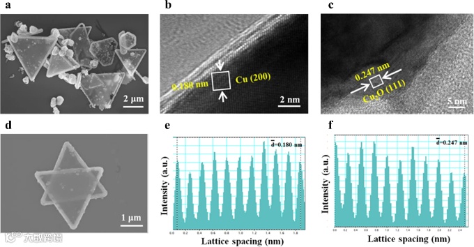 图 2. Cu/Cu2O-A的SEM和TEM图。a, d SEM 图。b, c TEM 图。e, f 分别从图像b和c中白色正方形标记的区域测量的强度分布图。