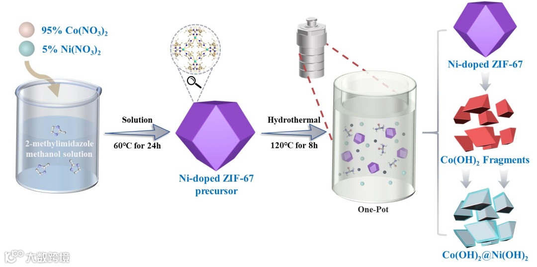 图1. Co(OH)2@Ni(OH)2异质结催化剂的制备示意图:以Ni掺杂ZIF-67为前驱体,通过一锅水热法实现骨架水解和氢氧化镍包覆两步转化。