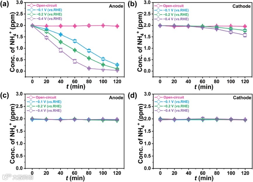 图3. 模拟电化学合成氨电解实验中不同(a和c) 阴极电解液和 (b和d) 阳极电解液两侧铵根浓度的变化情况