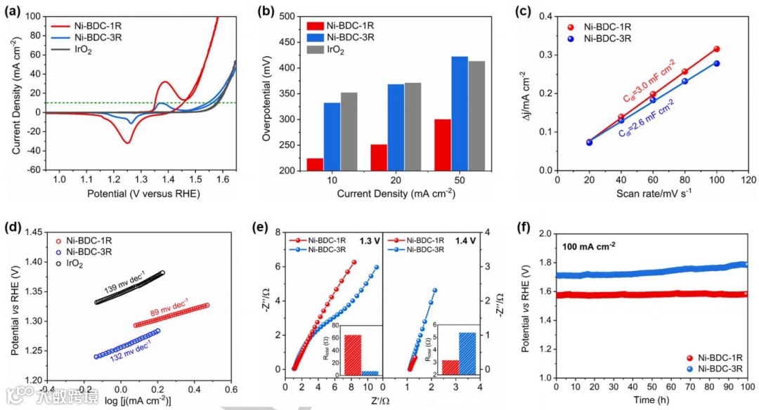 如图5a所示,Ni-BDC-1R在0.1 mA cm-2时的起始电位为1.40 V,低于相同条件下的Ni-BDC-3R (1.42V)。在10 mA cm-2电流密度下,Ni-BDC-1R表现出低至225 mV的过电位,远低于Ni-BDC-3R (332 mV)和商业IrO2 (353 mV) (图5b)。与Ni-BDC-3R (2.6 mF cm-2)相比,Ni-BDC-1R具有相似的Cdl值(3.0 mF cm-2),表明OER活性的显著差异并不归因于活性位点的数量(图5c)。然而,Ni-BDC-1R表现出比Ni-BDC-3R (136 mV dec-1)和IrO2(141 mV dec-1)小得多的Tafel斜率(89 mV dec-1),表明自重构MOF异质结内的加速OER动力学(图4d)。