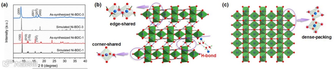 图2. Ni-BDC-1和Ni-BDC-3的PXRD与晶体结构分析。