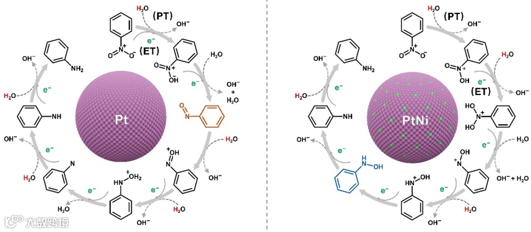 动力学同位素效应确认了质子来源于水且质子转移影响了决速步骤。pH相关性研究表明中性条件有利于PtNi催化表面上硝基苯加氢为苯基羟胺的过程,且遵循先质子转移后电子转移途径。