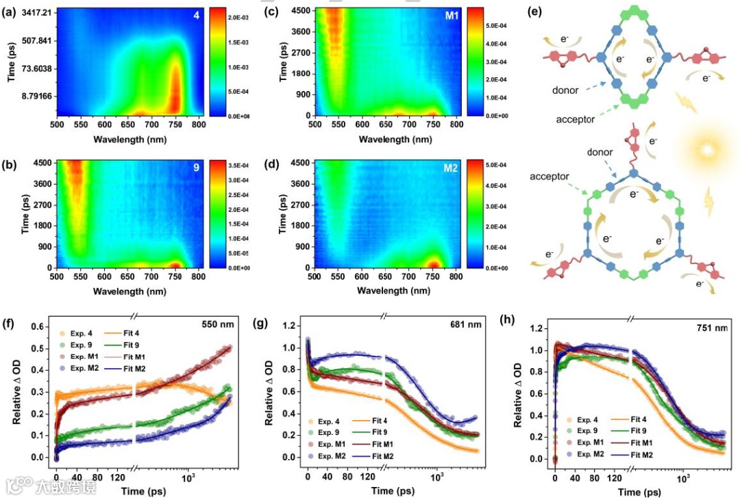 图 6. (a-d) 4、9、M1 和 M2 在 MeOH 中的瞬态吸收光谱。(e) M1/M2 中提出的 ICT 过程机制示意图。(f-h) 4、9、M1 和 M2 在瞬态吸收中的实验衰减曲线及其在 550 nm、681 nm 和 751 nm 处探测的拟合动力学轨迹(在甲醇中)。