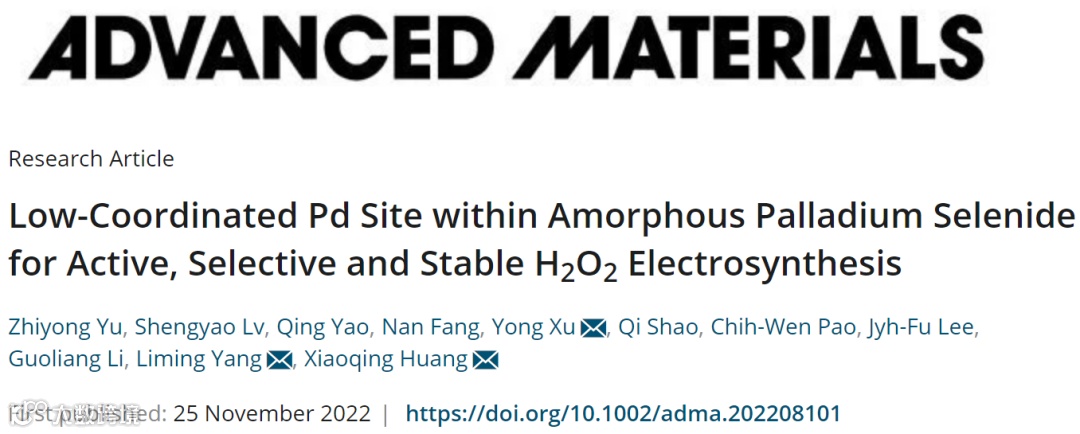 电化学还原法由于能够在温和条件下将O2转换为H2O2而引起了人们的广泛关注。因此,开发兼具高性能、高选择性以及高稳定性的优异催化剂对于电合成H2O2技术的实际应用至关重要,但目前仍然面临着巨大的挑战。本文报道了非晶PdSe2纳米颗粒(a-PdSe2 NPs)中Pd位点的低配位结构能够显著促进电催化合成H2O2。测试结果表明a-PdSe2 NPs在不同pH电解质中表现出超过90%的高选择性以及优异的产率,在三相流动池反应器中的测试结果进一步表明a-PdSe2 NPs在实际应用中的巨大潜力。详细的研究和理论计算结果表明,a-PdSe2 NPs中Pd原子的无序排布能够促进其活性,低配位环境下的Pd位点可以优化材料对含氧中间体的吸附,抑制O-O键的裂解,从而显著提高H2O2选择性和产率。